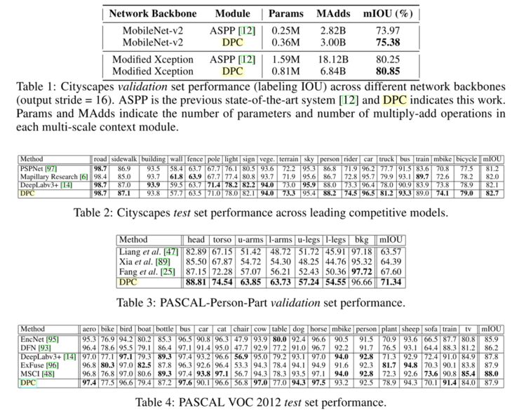 论文实验中,表 1,表 2,表 3分别对应在场景理解(Cityscapes),人体分割(PASCAL- Person-Part),语义分割(PASCAL VOC 2012)的模型性能,DPC 在各个数据集取得 state-of-art 性能。