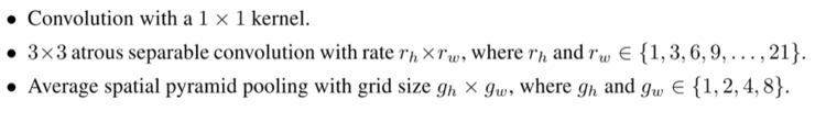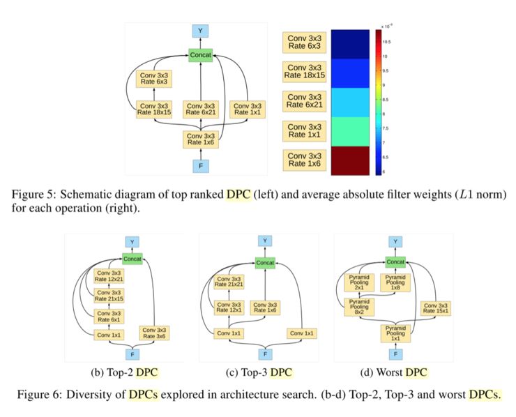 论文中图 5 、图 6 展示了顶级 DPC 架构的示意图。在图 5b 每个分支(通过 1*1 卷积)的 L1 正则化权重,我们观察到具有 3×3 卷积(速率= 1×6)的分支贡献最大,而具有大速率(即较长背景)的分支贡献较少。换句话说,来自更接近(即最终空间尺度)的图像特征的信息对网络的最终输出贡献更多。相反,性能最差的 DPC(图 6c)不保留精细空间信息,因为它在全局图像池操作之后级联四个分支。