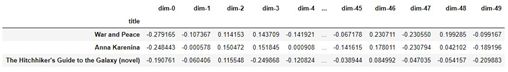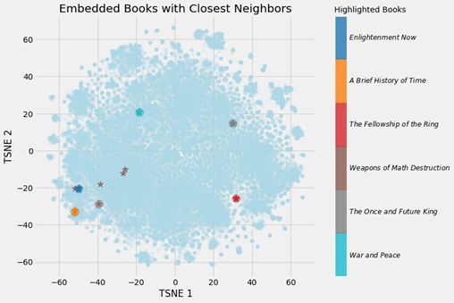 我们可以清楚地看到学习嵌入的价值!现在,对于维基百科上的每一本书,我们都有一个50 数字的表示,其中更相似的书籍也彼此更接近。