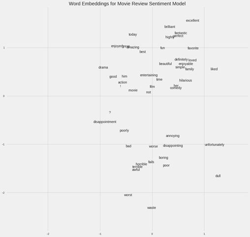 举个例子,如果我们有一个包含50000 个词的电影评论汇集的词汇库,我们可以使用一个嵌入神经网络来为每个词学习100 维的嵌入,训练目的是预测这些评论的情绪。(这个应用的详情请参阅:https://goo.gl/6rxG11)在这个词汇库中,「出色」和「很赞」这样积极的评论词会处于嵌入空间中更近的位置,因为网络已经学习到这些词都与积极评论相关。