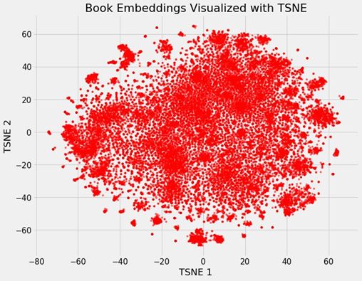 我们可以使用神经网络嵌入将维基百科上所有书籍的37000 个原始维度映射成50 维,然后再使用TSNE 将其映射成二维。结果如下: