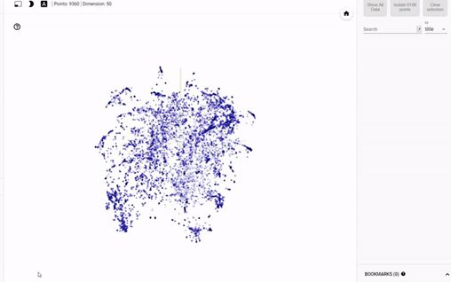 静态图表的问题是我们不能真正地探索数据以及研究变量之间的分组和关系。为了解决这个问题,TensorFlow开发了projector:https://projector.tensorflow.org/,这是一个让我们可以可视化嵌入并与之交互的在线应用。我后面会写一篇文章介绍使用这一工具的方法,但这里我们看看结果就好: