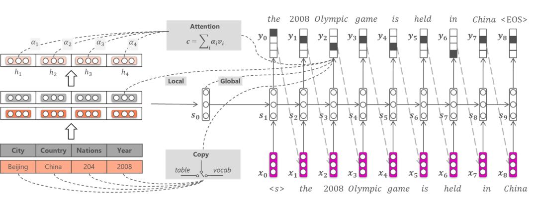 我们的模型基于Sequence-to-Sequence框架,如下图所示。为了考虑表格的结构性(如打乱表格的各列不改变其表示),我们在编码器模块没有使用序列化的形式去建模各个列的表示;为了有效从表格中复制低频词到输出序列,我们设计了基于表格结构的复制机制。
