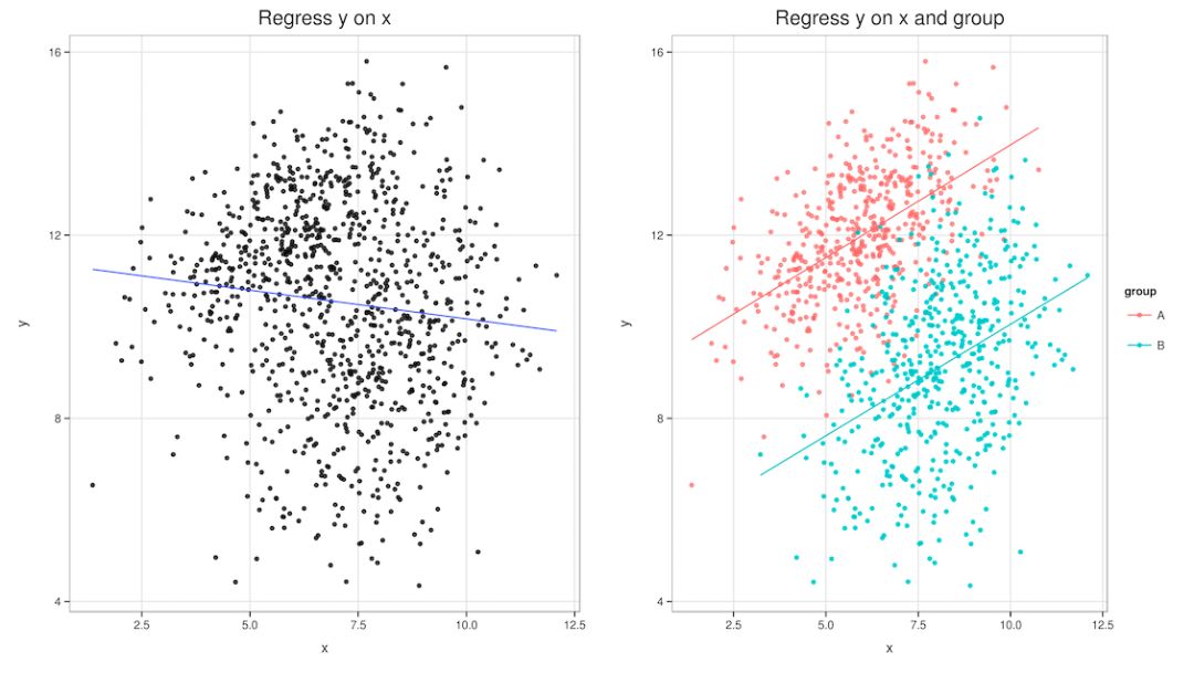 辛普森悖论:同一组数据,整体的趋势和分组后的趋势完全不同。