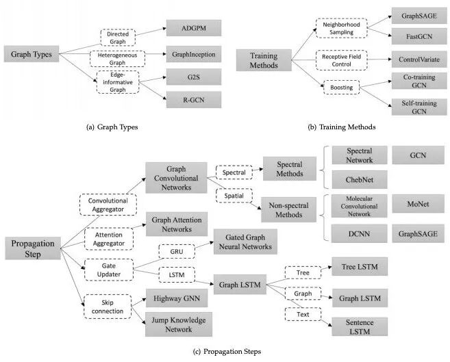 在这一节,我们提出图神经网络的几种变体。首先是在不同图类型上运行的变体,这些变体扩展了原始模型的表示能力。其次,我们列出了在传播步骤进行修改(卷积、门机制、注意力机制和skip connection)的几种变体,这些模型可以更好地学习表示。最后,我们描述了使用高级训练方法的标题,这些方法提高了训练效率。