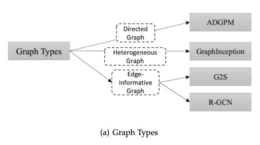 图形的第一个变体是有向图。无向边可以看作是两个有向边,表明两个节点之间存在着关系。然而,有向边比无向边能带来更多的信息。例如,在一个知识图中,边从head实体开始到tail实体结束,head实体是tail实体的父类,这表明我们应该区别对待父类和子类的信息传播过程。有向图的实例有ADGPM (M. Kampffmeyer et. al. 2018)。