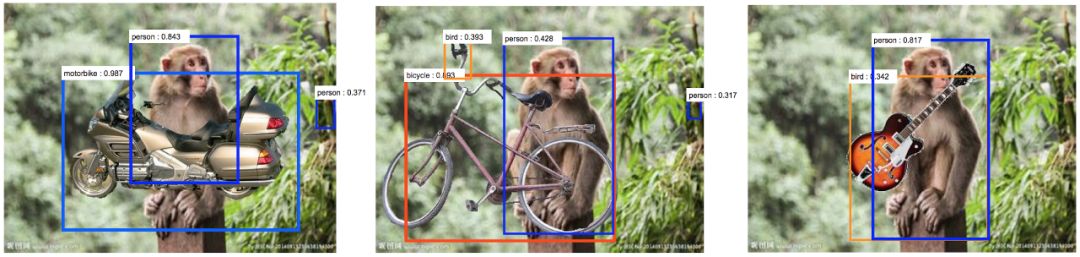 图3:添加遮挡致使深度网络失灵。左:用摩托车进行遮挡后,深度网络将猴子识别为人类。中:用自行车进行遮挡后,深度网络将猴子识别为人类,而且丛林将网络对车把的识别误导为鸟。右:用吉他进行遮挡后,深度网络将猴子识别为人类,而且丛林将网络对吉他的识别误导为鸟。