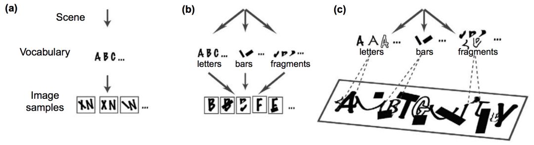 图4:从(a)到(c),可变性递增并使用了遮挡。(c)是一个庞大的组合数据集示例,本质上和验证码相同。有趣的是,关于验证码的研究表明,组合性模型的性能很好,但深度神经网络的表现却很差。